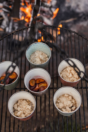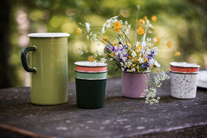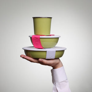 Emaille Set YIV – schadstofffrei & nachhaltig: Becher, Schale, Teller mit Deckel, Dichtung & Band