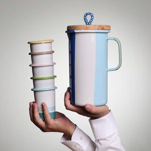 Der YIV Emaille Krug ist leicht, langlebig und aus natürlichen Materialien. Ideal für Wasser, Säfte oder andere Getränke, zu Hause, im Garten oder unterwegs. Handgefertigt, robust, recycelbar. Maße: Ø 11 cm, Höhe 22 cm, Fassungsvermögen 1,8 L, Gewicht 674 g auch mit passendem Arvenholzdeckel verfügbar.