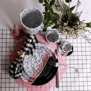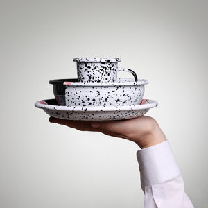 YIV Camping-Trio – Emaille Teller Ø 18 cm, Schale & Henkel-Tasse | handgefertigt & nachhaltig